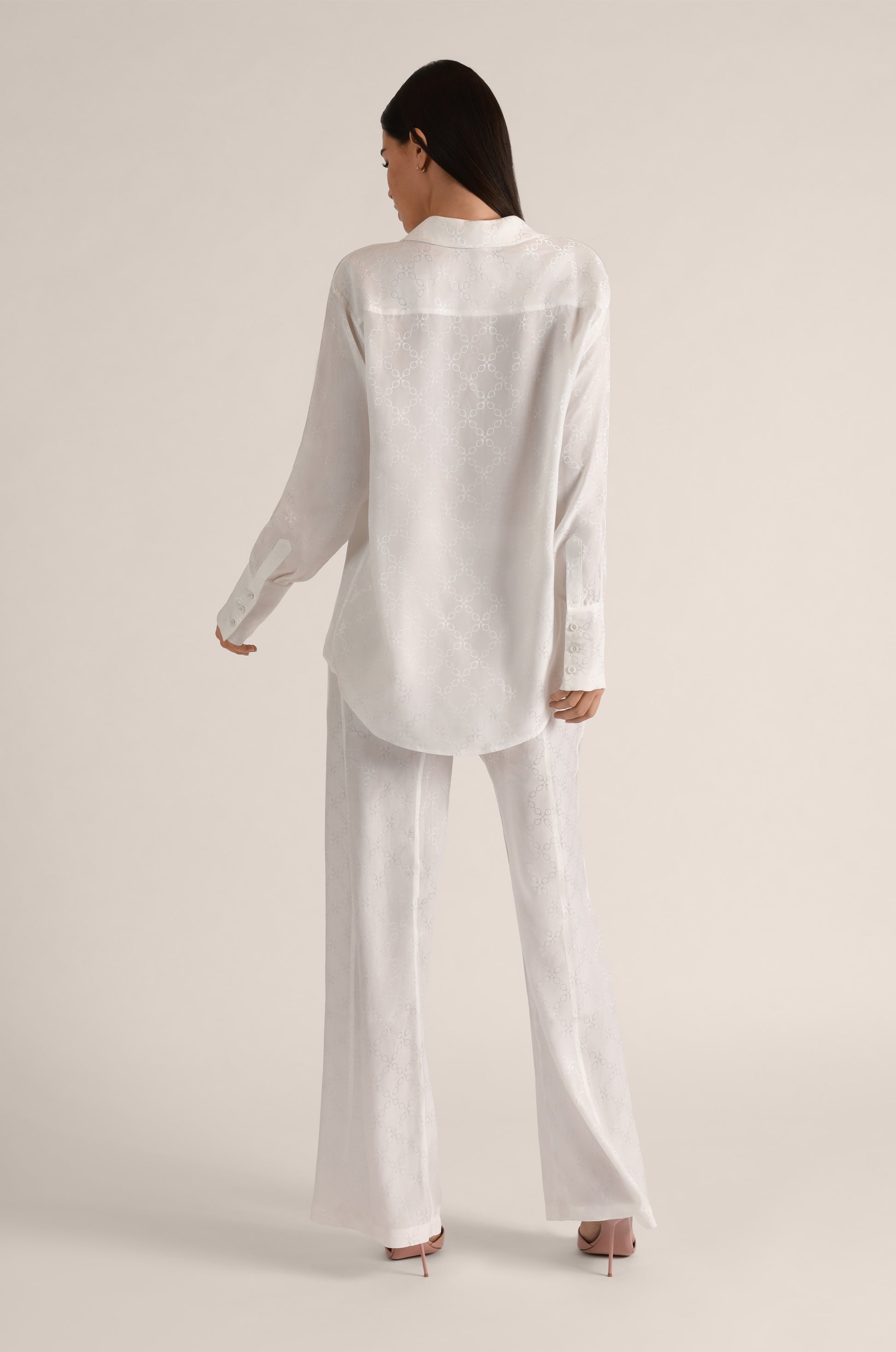 Made from 100% silk with a subtle sheen, the Handcuff Jacquard Long PJ Top is designed to catch the light in our signature Kiki handcuff print. Featuring a relaxed silhouette and a front pocket detail, it pairs seamlessly with the Handcuff Jacquard Boxer Short or Slim Boxer Pant for a chic, coordinated set.