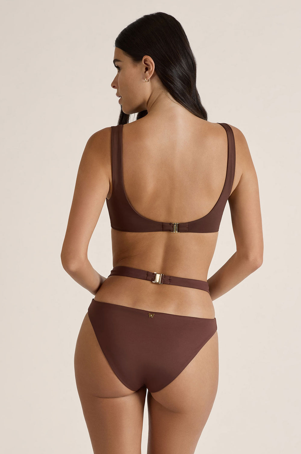 A statement in shape and shine. This cutout bikini top features an asymmetrical neckline that highlights the décolletage, accented by a gold O-ring detail. A low scoop back with a sleek clasp adds to its effortlessly striking appeal. Pair with our La Sirene Cutout High Waist Bikini Bottom for a perfectly coordinated look.